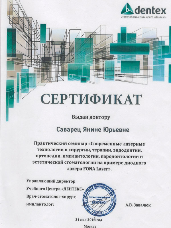 2018 - "Современные лазерные технологии в хирургии, терапии, эндодонтии, ортопедии, имплантологии, пародонтологии и эстетической стоматологии на примере диодного лазера FONA Laser" (DenTex)